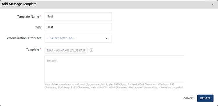 Push Template Element Description Modification Allowed Template Name Push template name Yes Template Title Title of the template to be used. Yes Personalization Attributes There are default personalization attributes: First name, Last name, Email, Mobile number, Country, and State Yes Mark as Name Value Pair A key-value pair is a set of two linked data items: a key, which is a unique identifier for a data type, and its value: the data such as, county:Iowa, state: wisconsin Yes The added details appears in the message box window.