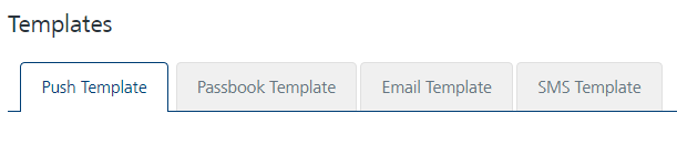 Under Settings, click Templates. The Templates screen appears with the four tabs Message Template, Passbook Template, Email Template, and SMS Template. By default, the Message Template tab is set to active.