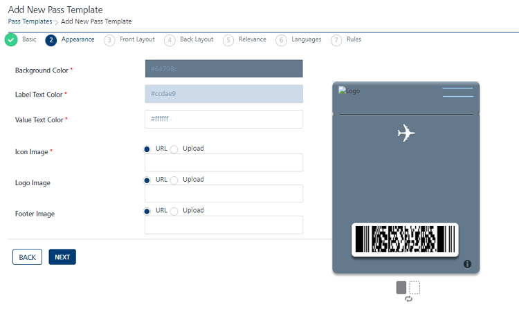 Logo Image: You can insert a logo image in the pass template through the two options: URL and Upload.