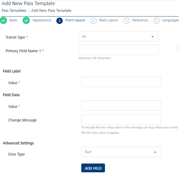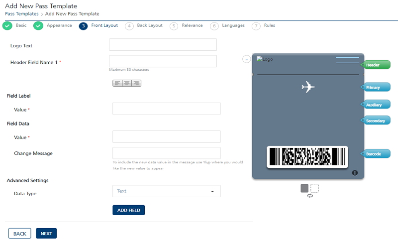 Adding Pass Template – Front Layout involves following details: