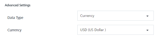 - Select the advanced data type as Currency, the Currency drop-down list appears.