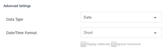 - Select the advanced data type as Date or Date and Time, the Date/Time Format drop-down list and Display relatively checkbox and Ignore timezone checkbox appears.