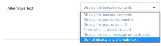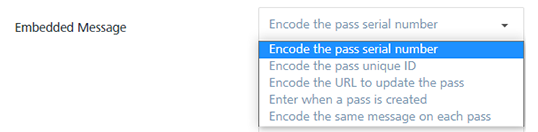 Embedded Message Description - Encode Pass Serial Number- Encode the pass unique ID The system uses the Pass Serial Number and Pass Unique ID, as the barcode message - Encode the URL to update the pass The system uses the pass update URL as the barcode message - Enter when a pass is created Enter the message when the template is used in the pass distribution -Encode the same message on each pass Enter the message. The system uses the same message for all the passes generated using the template.