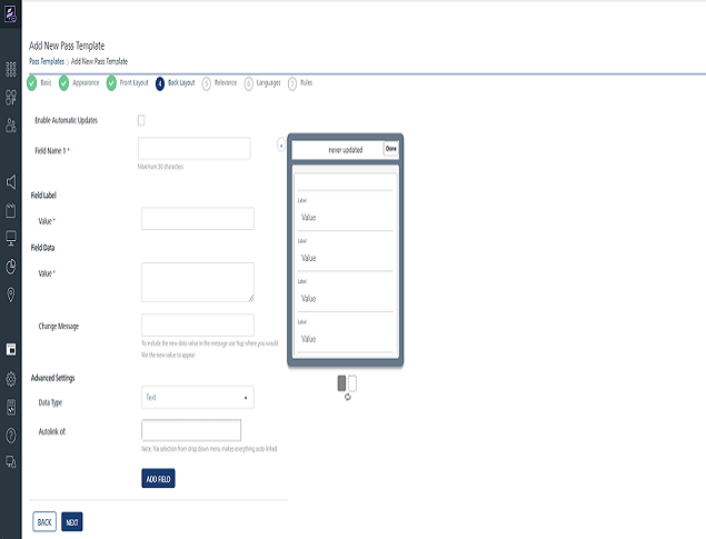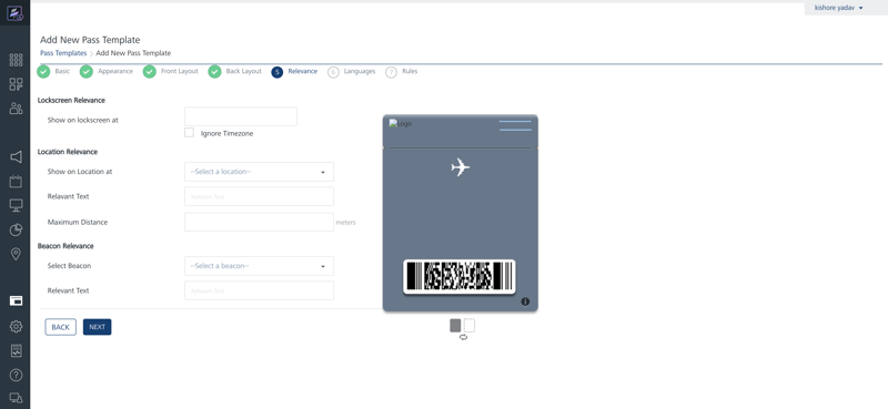 To add Pass Template – Relevance enter details for the following fields: