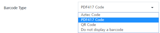 Note: The Aztec, and QR are the square type barcodes. The PF417 is a rectangular type barcode. Select the Do not display a barcode option, if a barcode should not be displayed.