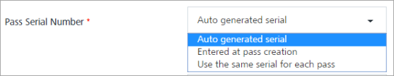 Pass Serial Number: The serial number is a string that uniquely recognizes the pass within the scope of its pass type. Select the required Pass Serial Number option from the drop-down list. By default, the option is set to an auto-generated serial number.