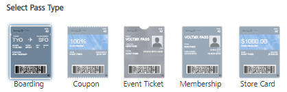 Select Pass Type: You can view five blank Pass Type templates on screen. The distinct design of the template is at the top edge of the pass: Event tickets have a small cutout, and coupons have a perforated edge.