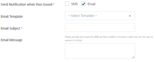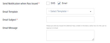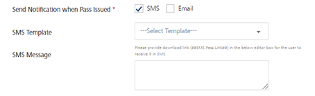 Send Notification when Pass Issued: Select the option as SMS or Email when a pass is issued.