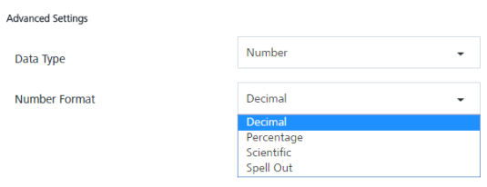 - Select the advanced data type as Number, the Number Format drop-down list appears.