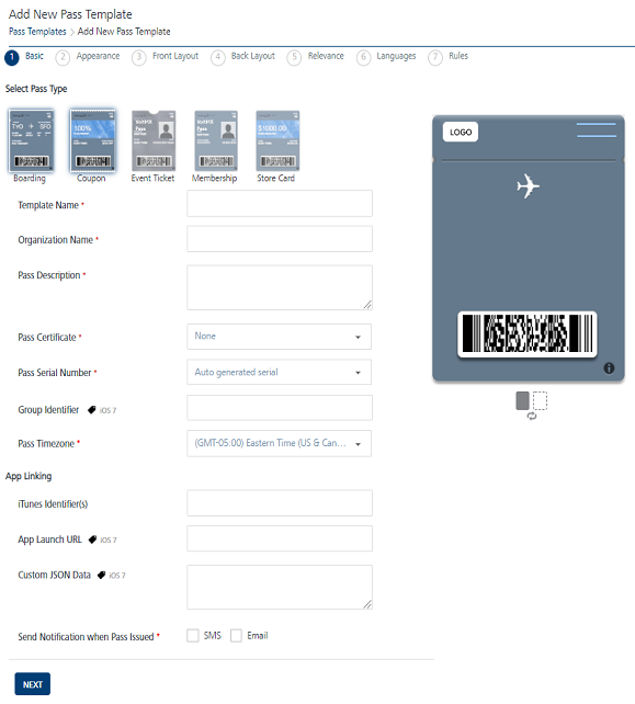 Note: The preview of the Pass Template can be seen on the right side.