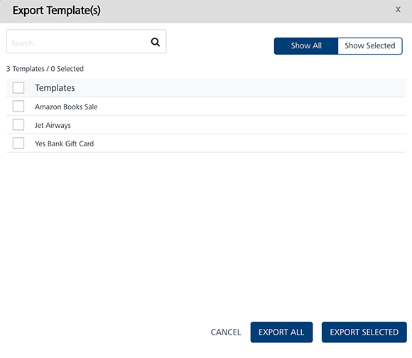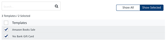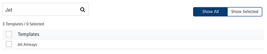 Show Selected: The Show Selected tab displays the selected pass templates in the list-view. Select the check-box next to the Templates header to select all the pass templates.