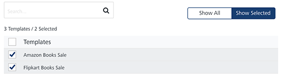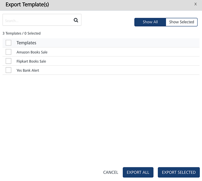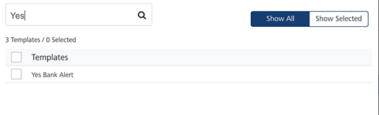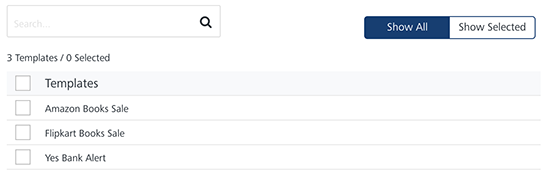 Show Selected: The Show Selected tab displays the selected SMS templates in the list-view. Select the check-box next to the Templates header to select all the SMS templates.