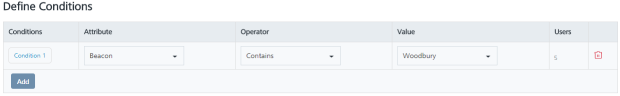 For the Woodbury Campaign, Lisa needs to add users who are associated with Woodbury beacon. So, Lisa chooses appropriate conditions to include users in the segment.