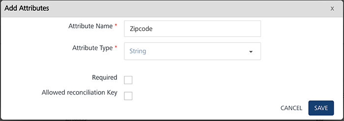 On User Attributes home page, Lisa clicks Add Attributes to open Add Attributes window. Lisa enters the attribute name as Zip Code and selects the attribute type as string from the drop-down list. Lisa can define zip-code as a required attribute by selecting the Required check box. Lisa clicks Save to save the custom user attribute.