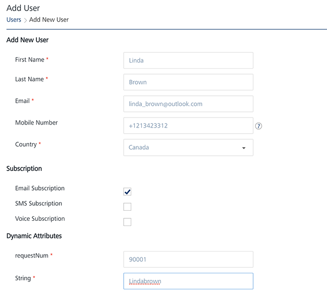 Lisa enters first name, last name, email, mobile number of the new user. Next, Lisa selects the country as United States and state as California from the drop-down list. By default, the user subscription is set to email and SMS channels.