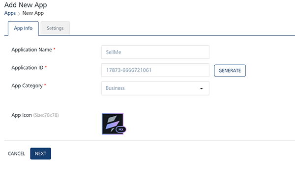 Lisa enters a name for the app like SellMe and select the app category from the drop-down list. Lisa clicks Generate to auto generate the Application ID.