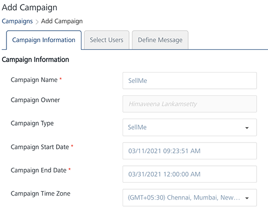 - Campaign Name: Lisa needs to enter an apt name for the campaign. The campaign name is displayed to the customers who receive push, email, SMS or pass notifications.
