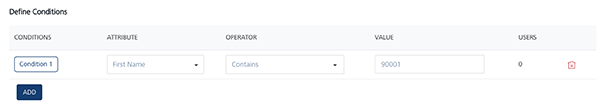 - Conditions: Lisa clicks Add to add a new condition row. A new condition is added with a condition number under the Conditions column in the grid. The condition numbers are the references to the user attributes that are associated with that condition. The numbered conditions can be used to define different combinations for a segment definition.