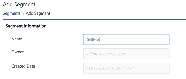 Name (mandatory): Lisa enters the name for the segment as SellMe Buyers List. Lisa receives a warning message, if a segment name is already defined. This warning is only a reminder that the segment is in use and Lisa needs to enter another name to define a segment.