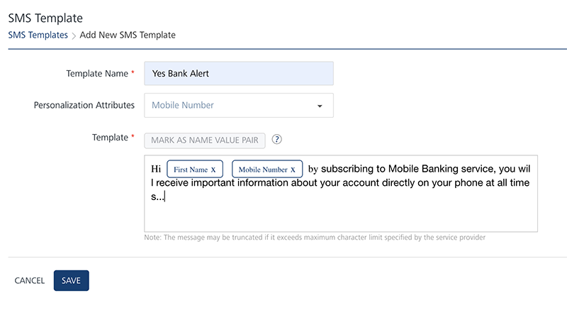 SMS is a really simple and accessible way of engaging customers. Usually customers receive text messages on a daily basis and are aware of this notification mechanism. So Lisa feels that SMS is a direct way to communicate the bank alerts to customers. Lisa can use tailor-made SMS message template that are supported by the Engagement server, to cater Yes Bank requirements.