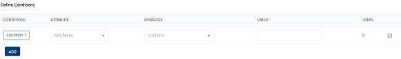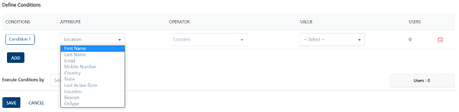 Attributes: Under the Attributes column, select the attribute from the drop-down list. You can select any user attributes or platforms as required. For example, First Name, Last Name, Email, Mobile Number, Country, State, Location, Beacon, Last Active Date, OSType, and any dynamic user attribute type.