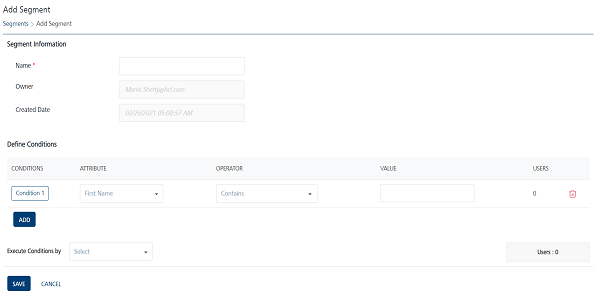 Select the execute condition as Match all conditions or Match any condition. Based on the fulfilled condition, the system inserts the number of users that qualify for the segment under the Users column.