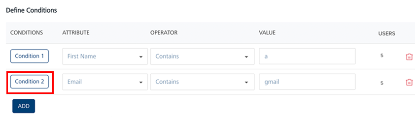- Conditions: Click Add to add a new condition row. A new condition is added with a number under the Conditions column in the grid such as Condition 2.