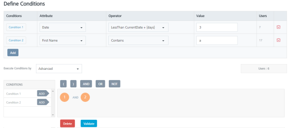 If you select the executive condition as Advanced, logic buttons appear. You can validate different conditions by using logic buttons while applying the segment definition. They are (), AND, OR, and NOT to create expressions.
