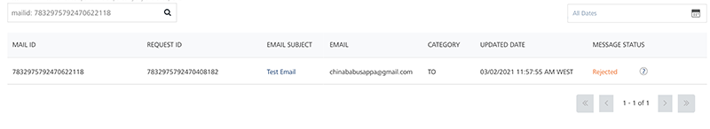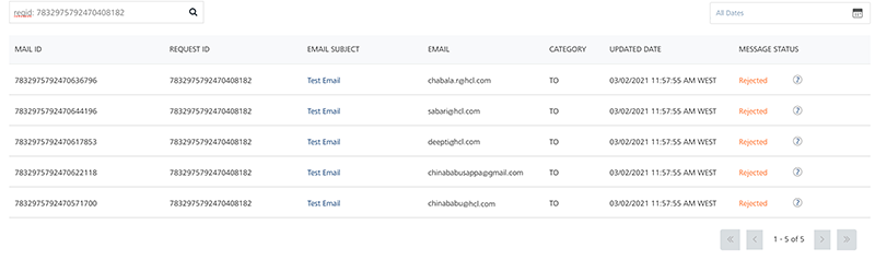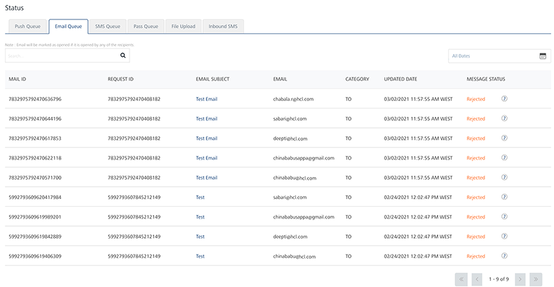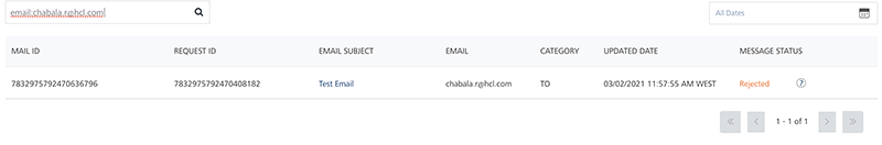 The Email Queue page displays the status of an email message for every user subscribed to the email service. The Status column displays the message status. Under the Status column, hover over an icon next to the Status to view more details related to the message status. For example, you can view reasons for the Undelivered, Rejected and Cancelled email messages. For more details, refer Status Messages.