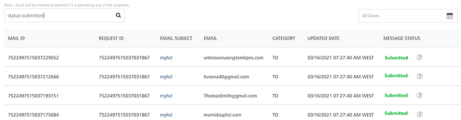 | Request ID | The column displays the unique ID assigned to email messages |