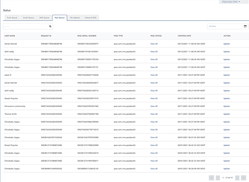 The Pass Queue page displays the status of a pass message for every single subscriber. Click View All under the Pass Status column to see the status of all passes that are in the system for the selected user. All the passes sent to a user for a pass type with a serial number are grouped and displayed under a single row in the Pass Status list-view. For more details refer, Pass Status.