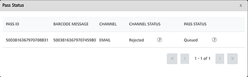 Pass Status Description Pass ID The unique ID assigned to a pass Barcode Message Barcode encodes the passes' unique ID and allows validation and bars against fraud or unwarranted uses Channel You can distribute passes through different channels, such as email, SMS, and the push message. The channel column displays the selected channel type by a user. To view the pass status, based on a channel type, select the required channel type from the drop-down list. If no record is found, then no record found message is displayed Channel Status The channel status column displays the current channel status. To know more about the channel status, see Channel Status Pass Status The pass status column displays the current pass status. Channel Status