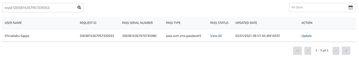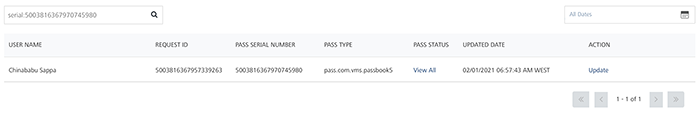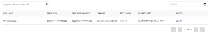 | Action | The column is used to update a pass status if needed. When you update a pass, you need to update data in a database before sending it to a user. If you try to update the pass that is sent already to the user, the system displays an error message stating that pass is not eligible for the update. |
