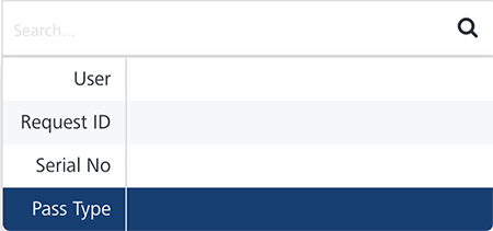 Search field: Click in the Search field to view options to search a pass. You can search passes based on the following criteria: