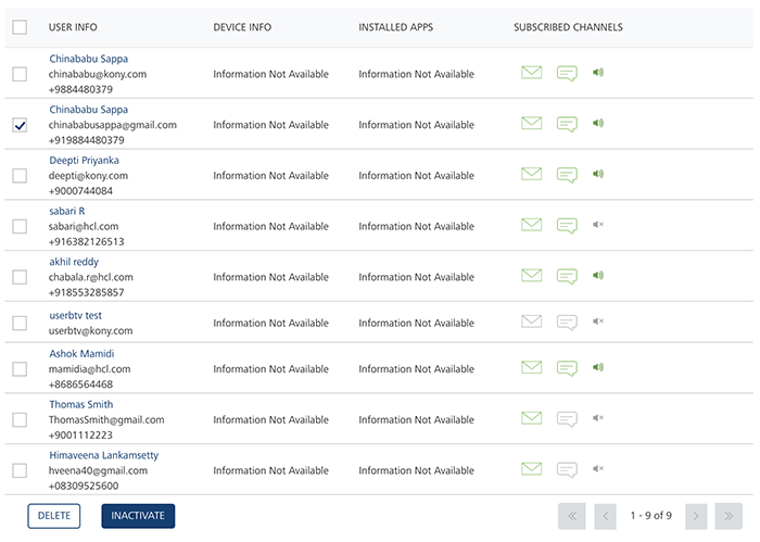 2. Click the Delete button. You can either select a single user or select all the listed users to delete in a single click of the Delete button.