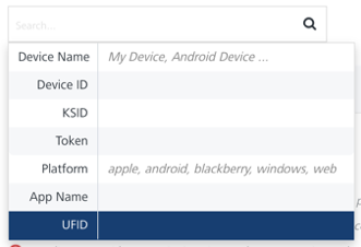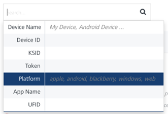- Search: Click in the Search field to view the available options to search a device. You can search devices based on the following search criteria: