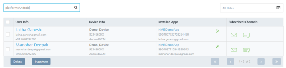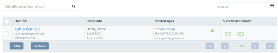 User Element Description User Info The column displays name, email, and mobile number of the added user. The User Info column contains a combination of the First Name and the Last Name of the added user Device Info The column displays the device name, device ID, and the platform name of all the devices that are associated with a user Installed Apps The column displays the app name, UFID and the KSID of each application that is installed on the user’s device Subscribed Channels The column displays the subscribed channels (email or SMS) to which the user has opted in Delete button The button helps you delete users from the list Inactivate Button Helps you inactivate users from the list. Inactivating also causes the user to opt out of email and SMS notifications Display Controls By default, the number range is set to 20 so that only 20 users are displayed in the list view. You can view more users through the forward arrow icon. You can navigate back through the backward arrow icon.