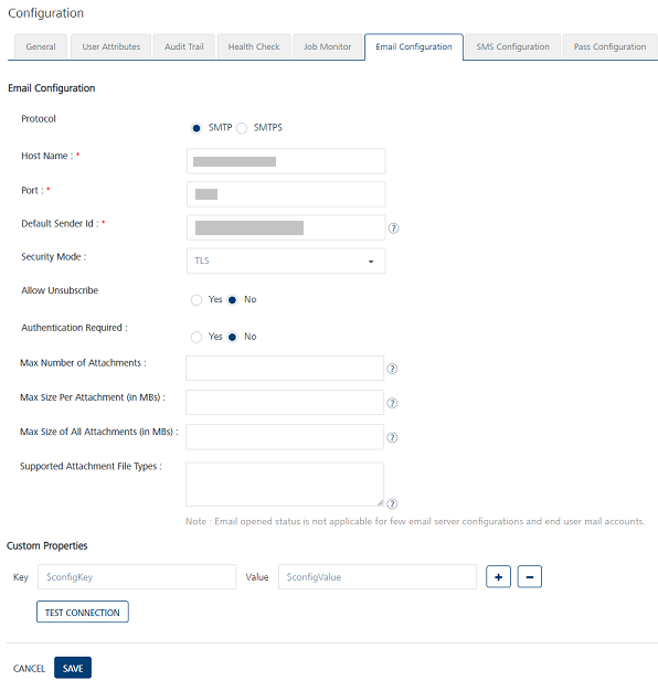 The system displays the Email Configuration page. The Email Configuration page includes the two sections: Email Configuration and Custom Properties.