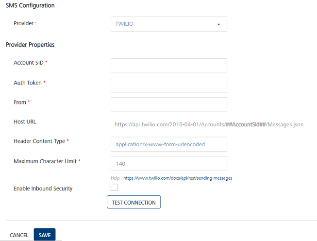 You need to sign up with Twilio for a free trial or a paid account so that the Account SID, Auth Token, Account Name, and the Host URL are provided. The SMS Configuration screen can vary based on the SMS service provider chosen. The screen below assumes that Twilio is chosen as the service provider.