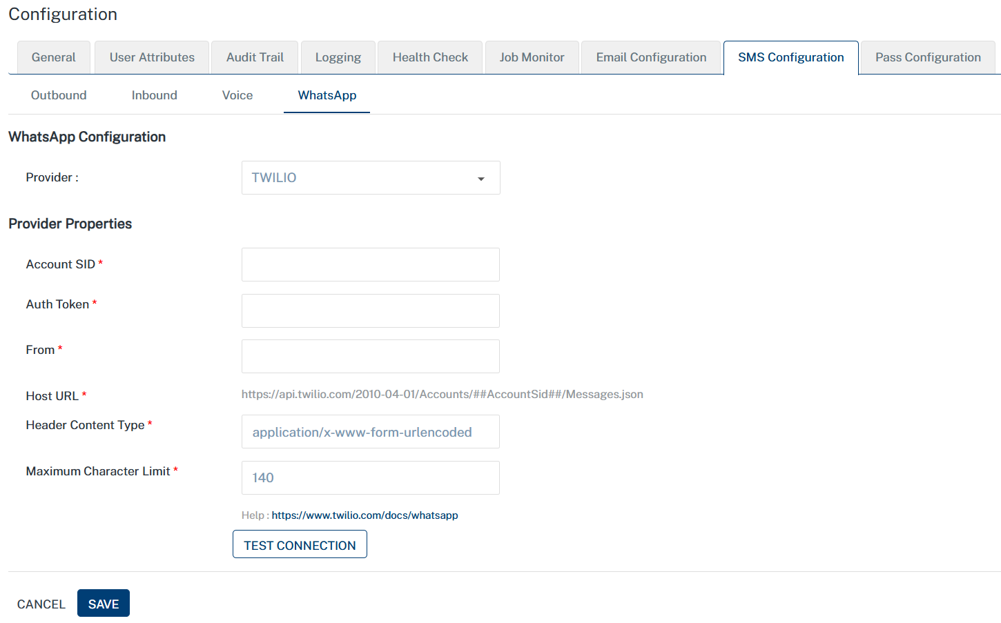 Click the SMS Configuration tab then click on WhatsApp. Twilio is WhatsApp service provider.