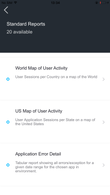 The Volt MX Foundry mobile app provides all of the standard metrics and built-in reports for Volt MX Foundry. For information about standard reports, see Standard Reports and Analytics Guide.