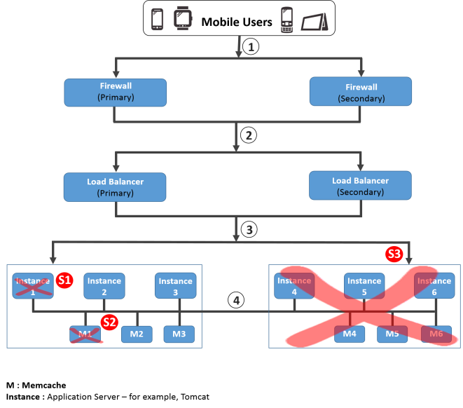 In this scenario, if the session data is stored in the Memcache instance that is down, there will be a transaction failure. All the users whose session data was stored on the Memcache instance that went down, have to reinitiate the transaction.