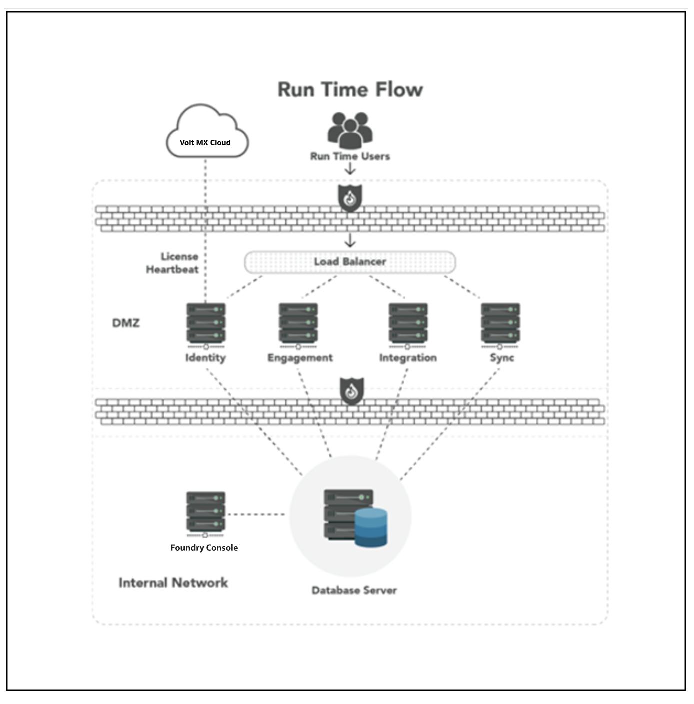 The following diagram depicts the topology of a typical deployment of Volt MX Foundry in a Production environment. Individual components can vary based on specific requirements.