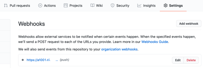 - You can Edit or Delete a Webhook by clicking the respective button. For more information about Webhooks, refer to the GitHub Webhook Documentation.
