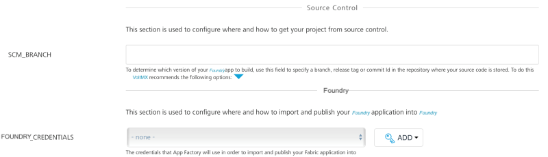 FOUNDRY_CREDENTIALS_ID - A Volt MX Foundry user and password which App Factory will use to build your Iris project on your behalf. If you choose to build Web channel, these credentials will be used to upload the generated .war/.zip file to Volt MX Foundry and also to publish the application if PUBLISH_WEB_APP is selected.