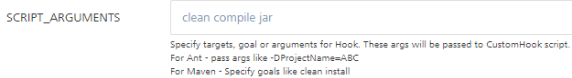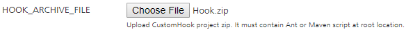 HOOK_ARCHIVE_FILE Specifies the archive file for the Custom Hook. For more information, refer to Custom Hooks.To upload an archive file, click Choose File, and then select the custom hook zip file from the file explorer. SCRIPT_ARGUMENTS This text field specifies the arguments you want to pass to the Custom Hook Script. These arguments are specific the targets or goals for the script. If you leave the Script Arguments empty, the Custom Hook script will only execute the default goals.