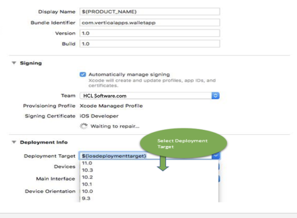 For example, if you have installed Volt MX Iris on your Mac machine. You follow a few manual steps to build the IPA by extracting the KAR on your Mac machine. During the IPA generation, you perform additional manual settings in the Xcode project to change the deployment target as shown in the following image.