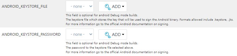 The keystore file stores the key that is used to sign the Android binary. To build a Visualize app for Android, you need to add an Android_Keystore file and an Android_KeyStore password to your project.