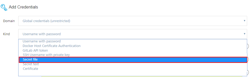 3. In the Add Credentials window, from the Kind list, select Secret File.