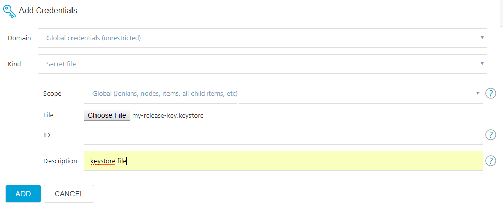 If you use the same keystore for multiple apps, you can add the keystore file at the Jenkins scope to use it across different projects. If you use different keystores for different apps, you can add the keystore file at the project level scope.